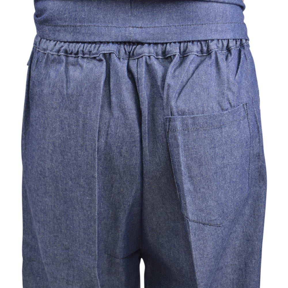 100% cotton, in a soft, light-weight denim material which balances comfort with durability.  This Samue set consists of a comfortable, wrap over style jacket with internal fastening ties and drawstring waist trousers complete with pockets and fold over ankle ties.